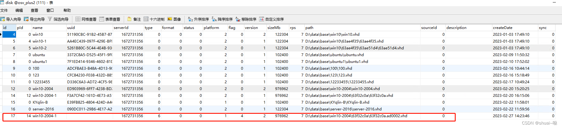 在打开数据库工具找到disk表,打开并找到上传失败的镜像记录将其删除(注意这里指的是生成失败的AD那条记录并不是磁盘镜像记录)如图: