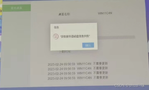 情况二:在终端客户机正常运行的情况下会弹出下载界面并伴有提示“获取磁盘失败”的字样。如图所示: