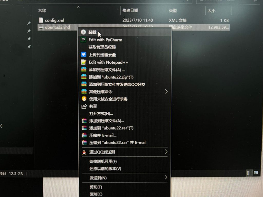 (1)找到上传的VHD镜像文件挂载此VHD文件,鼠标右键点击“装载”如图: