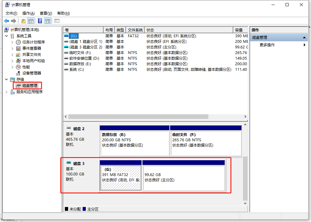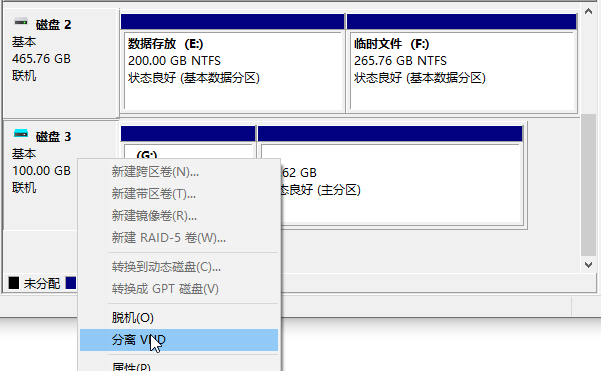 (3)替换完成之后在“计算机管理”,“磁盘管理”分离刚才挂载的vhd文件,如图展示: