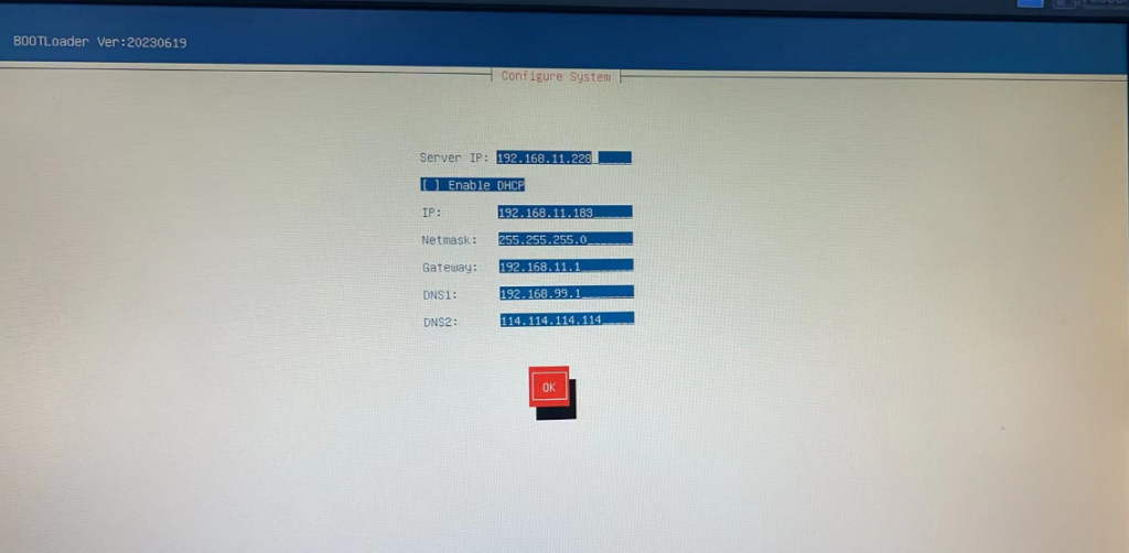 在进入BootLoader页面之后可能会手动输入ip信息,尝试和服务器取得通讯,主要操作为:在BootLoader界面按F2,会自动跳出修改网络信息,如图: